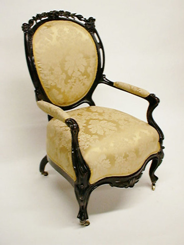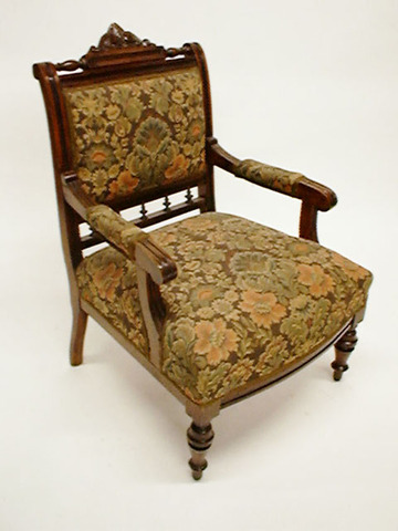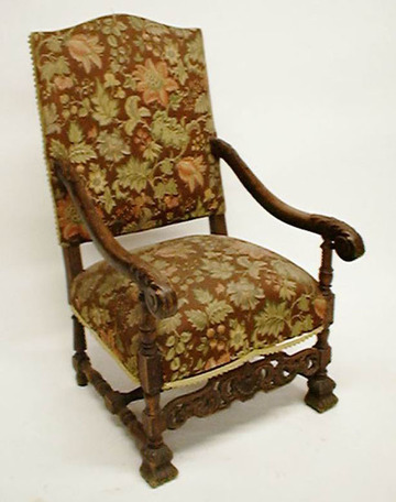 Sessel Barock Eiche reich geschnitzt, Polster braun geblümt Gobelin