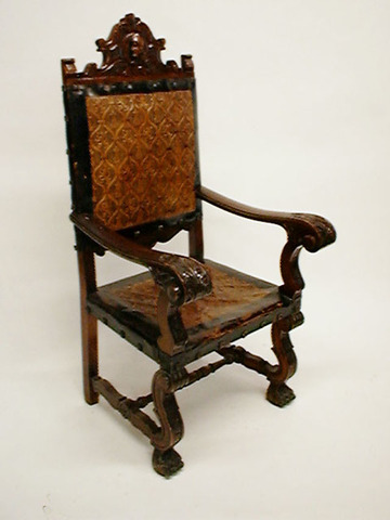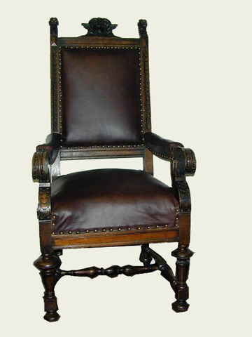 Armlehnsessel 1880 hochlehnig reich geschnitzt mit Löwenköpfen, Polster Leder dkl.braun, 60x65, h 127cm