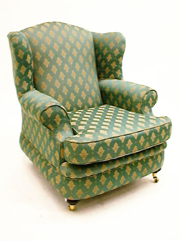 Armlehnsessel dkl. Nussb, kannel. Säulenfüsse, grün gemustertes Velourspolster
