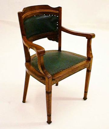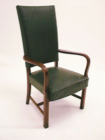 Gerichtssessel hochlehnig um 1930 grün Leder, mit Holzarml.