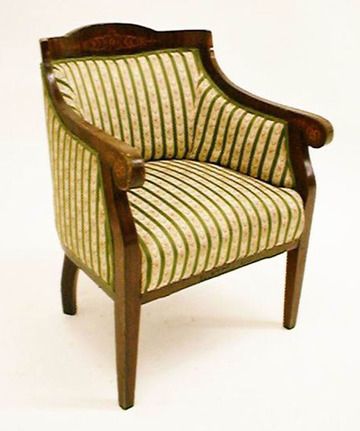 Sessel, BIE, Nussbaum, m. Intarsien, Polster grün/beige gestreift, halbrund
